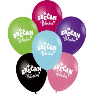 Gumeni rođendanski balon u više pastelnih boja sa print natpisom “Srećan rođendan”, obima 30 cm. Moguća usluga helijuma u radnji (usluga helijuma za gumene balone iznosi 200 dinara).